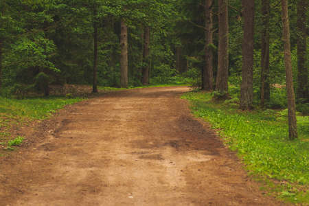 Beautiful empty path through a forest in forest. Rural landscape in summer, Europe banner of beautiful empty dirt road in green forest in summer.cloudy warm day. Natural background.