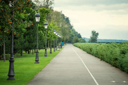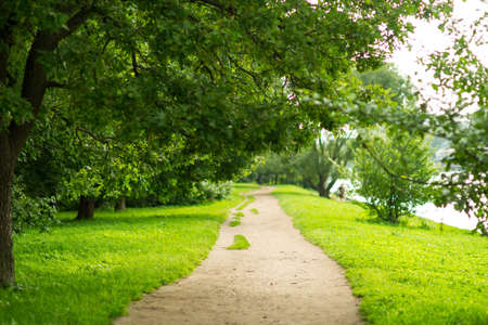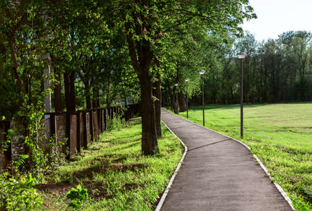 Wonderful fresh summer morning. The sun's rays illuminate the paved path.