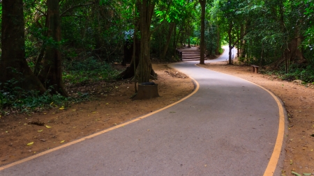 park track foot path asphalt road curved way between vivid green foliage of trees in wood land natural atmospheric environment space shadow