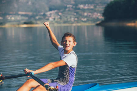 A Young single scull rowing competitor paddles on the tranquil lake