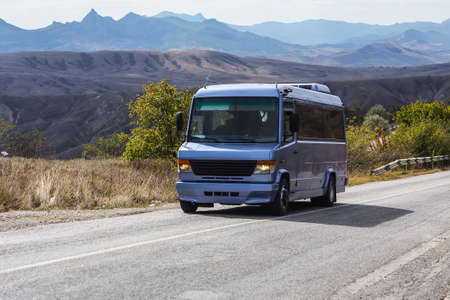 Bus drives along a road against a mountainous background.