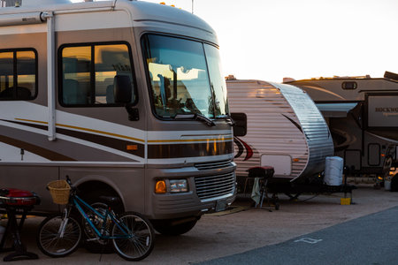 Caravan rv camping on mediterranean coast in Spain. Holiday trip in mobile home.