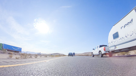 HWY 15, California, USA-December 3, 2022-Embarking on a road trip from Nevada to California, driving on Highway 15 during the day offers scenic views and an exciting journey between states.