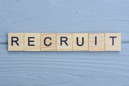 text the word recruit from wooden small letters with black font on an gray table