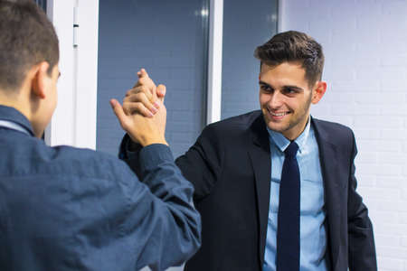 Manager congratulating a young employee with a handshake