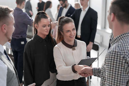 Young girl performs a handshake with her client in her office