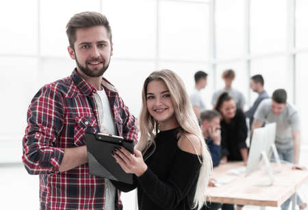 young colleagues with business documents standing together.