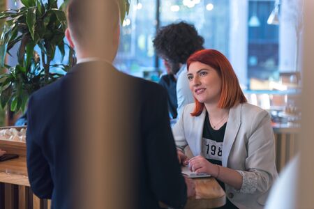 Young business people talking with each other about new projects at a coffee bar