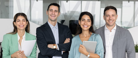 Happy diverse business friends standing in office together, looking at camera, smiling. Successful team of colleagues, agents, financial consultants, managers posing for banner shot portrait