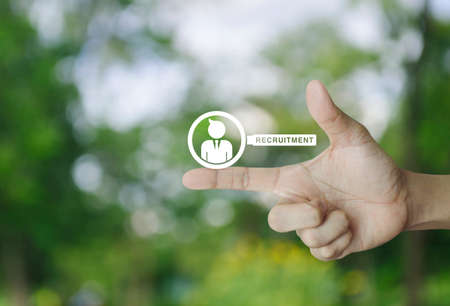 Businessman with magnifying glass icon on finger over blur green tree in park, Business recruitment concept