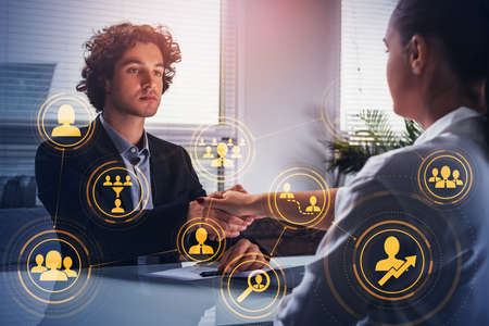 Concept of partnership. Business people handshake over hologram social media people icons and worldwide recruitment process. Looking for new employees for the international project.