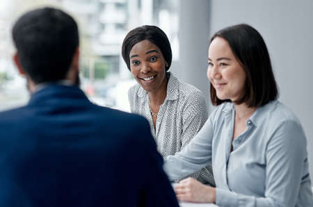 Business partners discussing documents and ideas at meeting and communicating at the office.