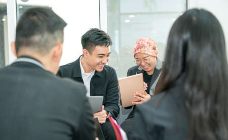 Asian man colleague friendship meeting at work. Happiness two men colleague working together team meeting in office desk. Team business partners working with computer laptop startup small company.