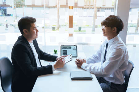 Job seeker listening interview employee talk about job description for job interview in the office, Job applications concepts.