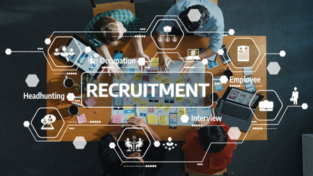 A person interacts with a laptop displaying recruitment graphics, including icons related to hiring and interviews, emphasizing modern employment practices in a professional setting. Tessel