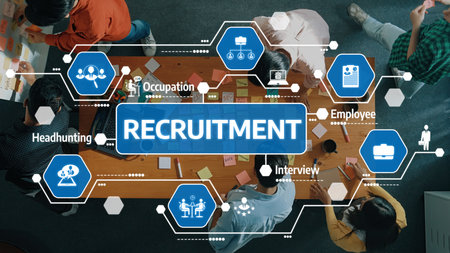 Recruitment Process Illustrated with Diverse People Collaborating Around a Table, Featuring Icons for Headhunting, Interviews, and Employment Dynamics.