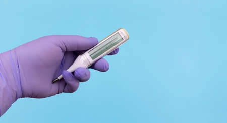 Hand in glove holding a thermometer of the health of medicine on a blue background. A place for text or design.