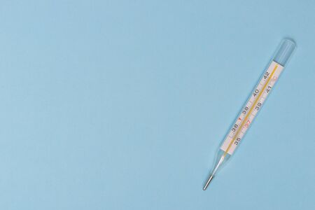 Mercury thermometer on a blue background, with copy space, top view.