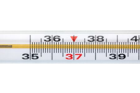 close up of thermometer with 36 and 6 on white