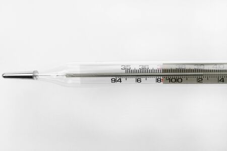 Medical thermometer for measuring body temperature on a white background. old Mercury Medical Thermometer. Scale in degrees Celsius. Health and Illness concept
