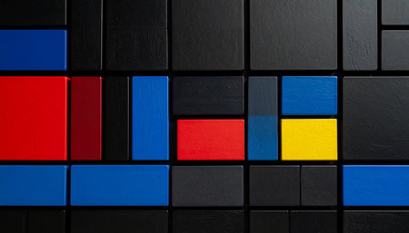 Playful patterns of building blocks showcase vibrant geometric shapes in primary colors