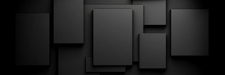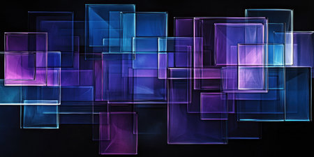 Abstract background with blue and purple geometric shapes, forming an abstract composition on a black backdrop. High-resolution 3D rendering of an abstract design with glass squares. The concept symbolizes technological innovation in digital marketing, advertising, or web development. --ar 2:1 --v 6.1 Job ID: abc5d4ac-cb8f-410f-8b47-aa75bf1a19bc