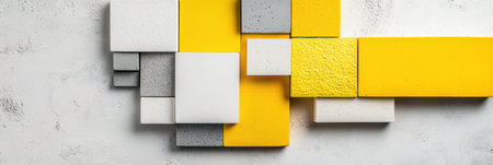 An artistic arrangement of vibrant yellow, sleek gray, and crisp white geometric shapes creates a striking visual impact. The interplay of colors and forms evokes a sense of modernity and creativity, perfect for design projects or contemporary art displays.