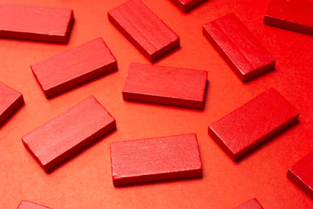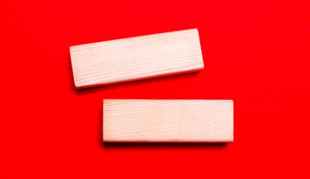 On a bright red background, there are two light wooden blocks with a place to insert text.