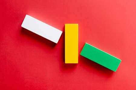 top view of green, white and yellow blocks on red background