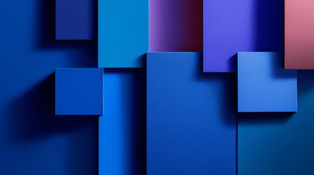 Geometric shapes in various shades of blue and purple create a striking visual harmony with shadows.