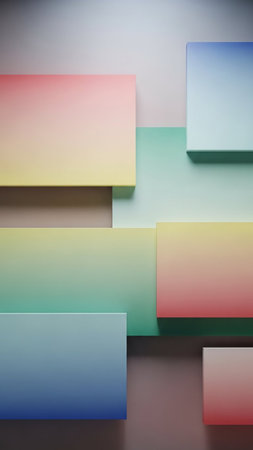 Aesthetic showing a minimalist abstract composition of rectangular blocks with soft color gradients in pastel shades of pink, yellow, green, and blue arranged on a...