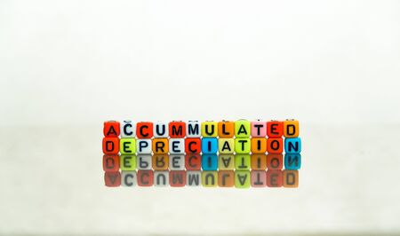 Conceptual of accumulated depreciation in financial statements. Colorful alphabet beads stacked forming the words over dark table. Selective Focus.