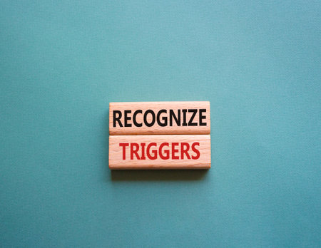 Recognize triggers symbol. Concept words Recognize triggers on wooden blocks. Beautiful gray green background. Business and Recognize triggers concept. Copy space.