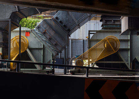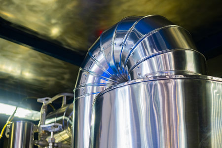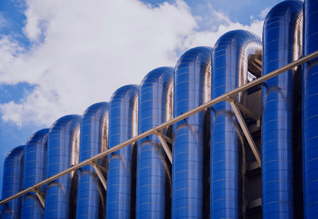 A striking view of intricate metallic ductwork and pipes in a modern industrial environment, showcasing unique lines and forms with vivid details.