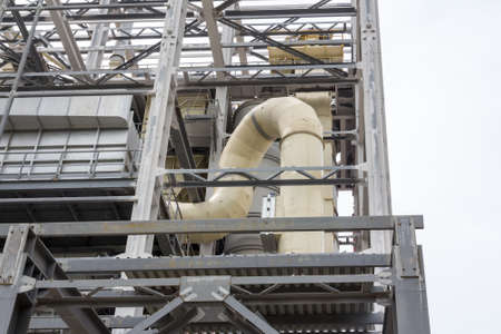 Metal air ducts at the enterprise. Ventilation and air conditioning. Metal structures in the workshop. Steel curved pipes. Steel tank with pipe.