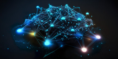 Neural network shown with shimmering connections and lights, symbolizing data flow, creating futuristic visualization