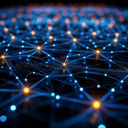 3d render of network structure with glowing dots and lines on dark background