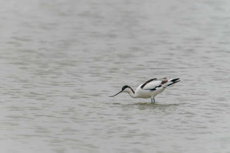 A Pied avocet walking through water and looking for food, cloudy day in winter in Camargue (Provence, France)