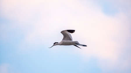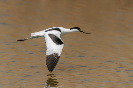 Water bird pied avocet, lat. Recurvirostra avosetta, flies over the lake. The pied avocet is a large black and white wader with long, upturned beak and long, bluish legs