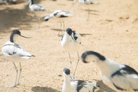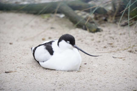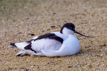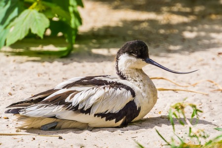 closeup portrait of a pied avocet sitting on the ground, black and white wading bird with a curved bill, migratory bird from Eurasia