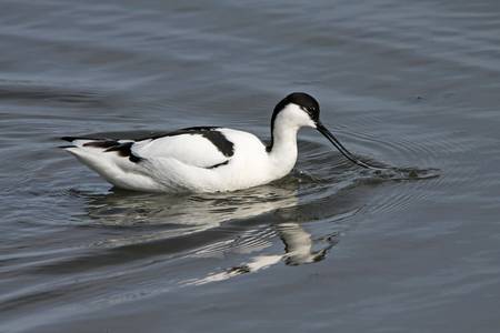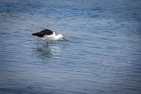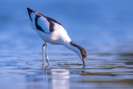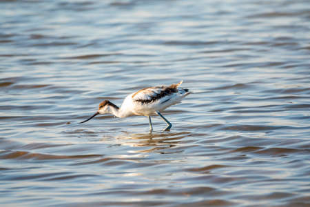 Water bird pied avocet, Recurvirostra avosetta, feeding in the lake. The pied avocet is a large black and white wader with long, upturned beak and long, bluish legs