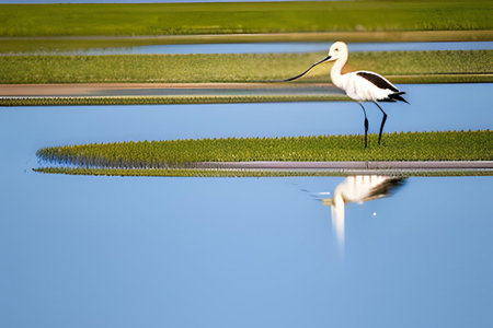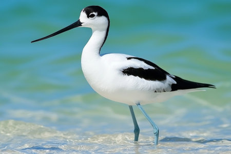 striking bird navigates shallow waters with poise, its long, upturned beak perfect for foraging. The pied avocets distinctive black-and-white plumage stands out beautifully.