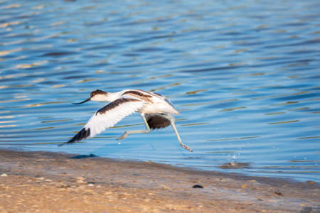 Water bird pied avocet, lat. Recurvirostra avosetta, takes off from the shore of the lake. The pied avocet is a large black and white wader with long, upturned beak and long, bluish legs