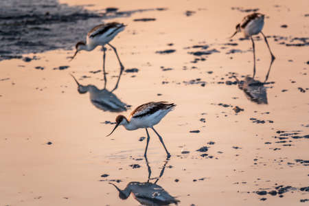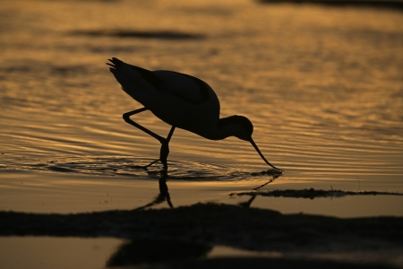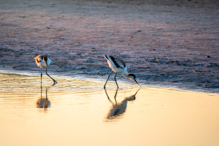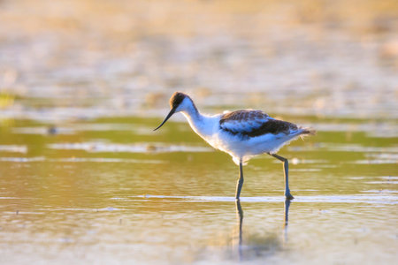 pied avocet (Recurvirostra avosetta) wading in water in early orange light and looking for food during sunrise