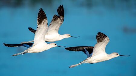 American Avocet shorebirds, Recurvirostra Americana, fly over a marsh in Southern California in spring