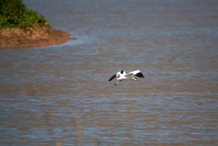 A Pied Avocet flying low over water, sunny morning in springtime, Camargue (Provence, France)