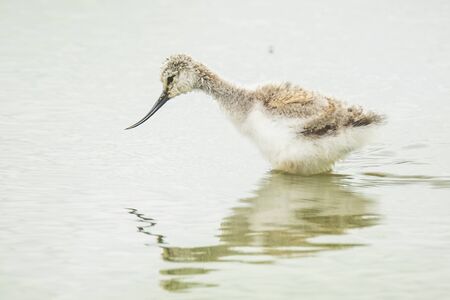 Pied Avocet chick, Recurvirostra avosetta, walking in water in search for food.