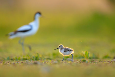 Pied Avocet, Recurvirostra avosetta, parent looking after chick walking in water and foraging insects in a grass field