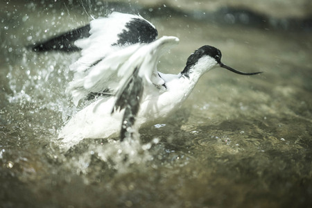 Image of black and white avocet frolicking in the pond