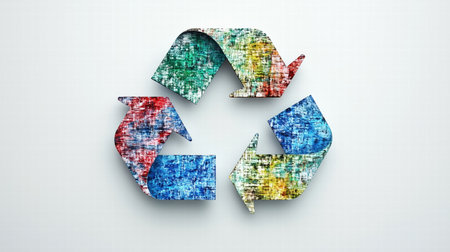 Vibrant recycled art symbol made from assorted colorful materials, demonstrating creativity and commitment to environmental awareness and sustainability.